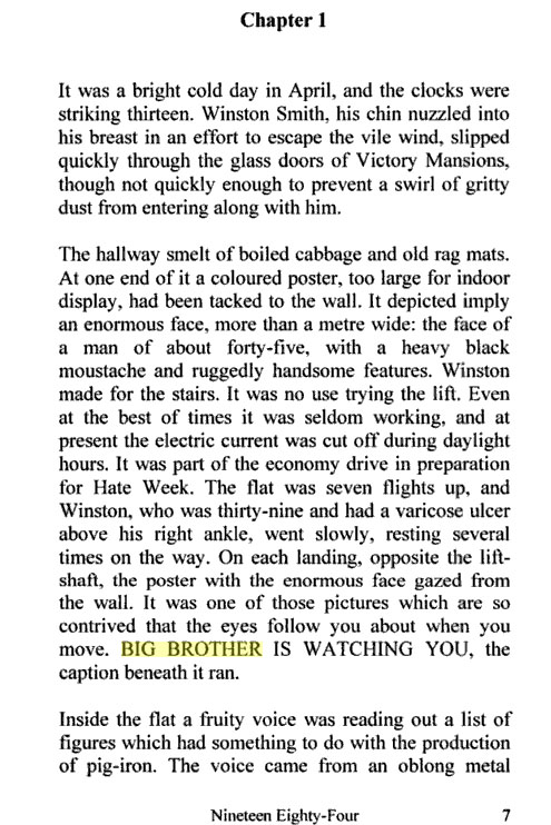 It was one of those pictures which are so contrived that the eyes follow you about when you move. BIG BROTHER IS WATCHING YOU, the caption beneath it ran.(Ací en teniu una imatge)